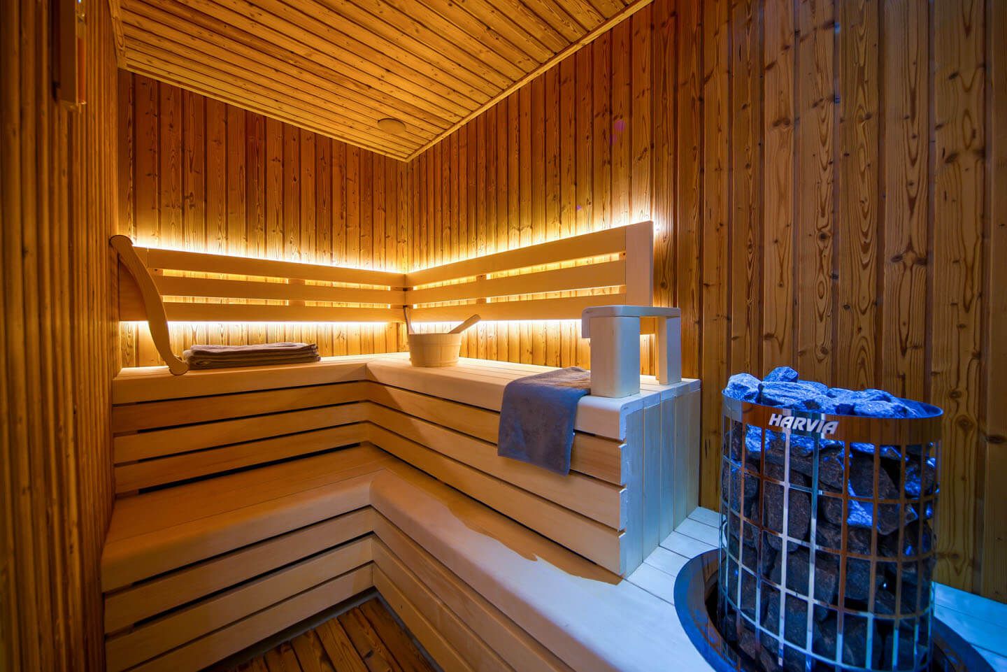 The ground floor has a one bedroom apartment, consisting of a small kitchen, sitting/dining room with a double sofa bed, TV, a double bedroom, a shower room and a separate bathroom. In addition there is a proper, double height wellness area and spa with an indoor pool, Finnish sauna, steam bath and a massage room.